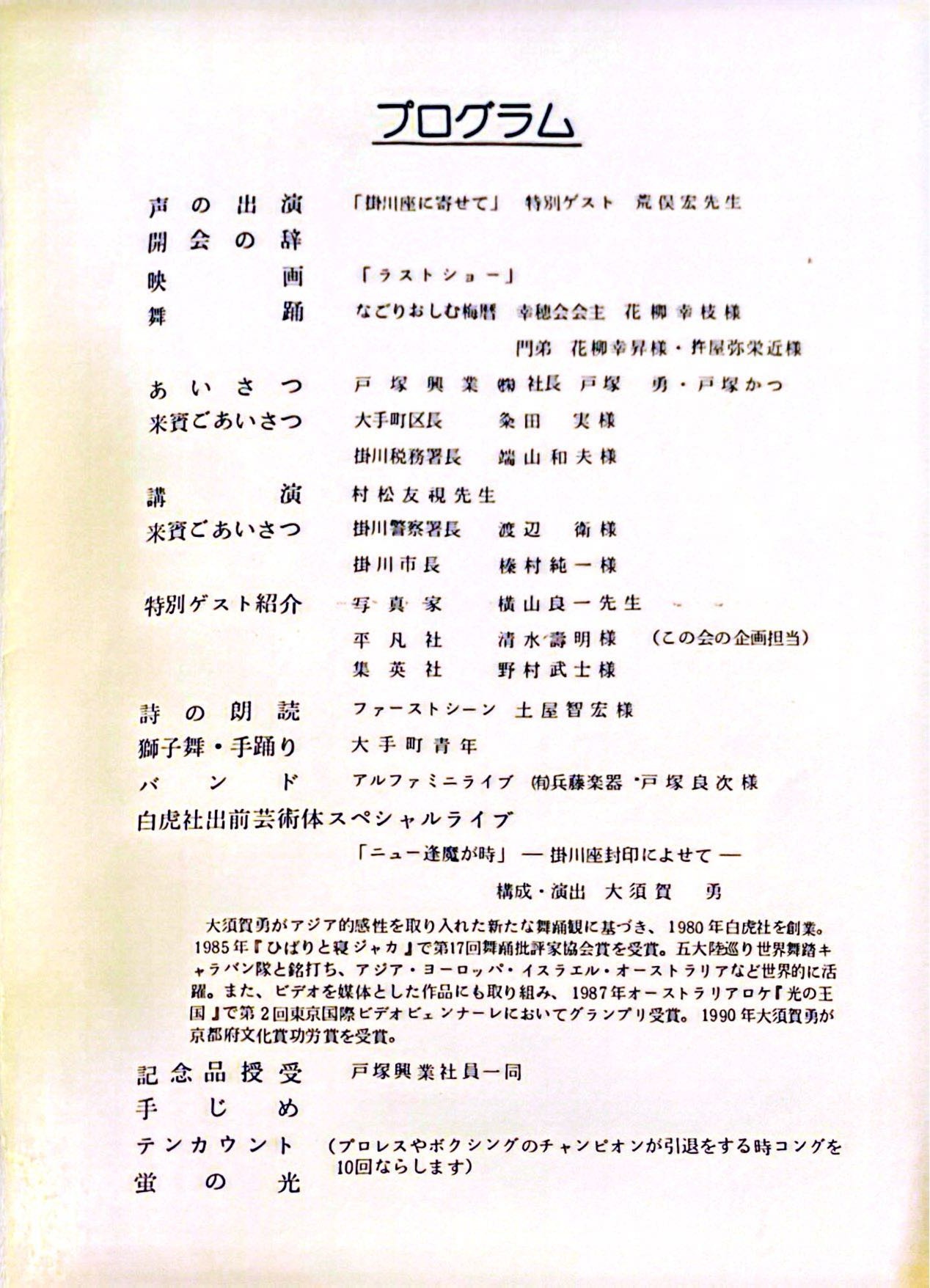 静岡県掛川市にあった「掛川座(かけがわざ)」の閉館イベント「私達の掛川座よ さようなら」で、白虎社の出前芸術体が上演した「ニュー逢魔が時ー掛川座封印によせてー」の記録。掛川座は明治42年に建てられた回り舞台も備えた本格的な芝居小屋で、戦後には映画も上映した。村松友視の講演や『掛川座: ぼくのシネマパラダイス』の著書もある土屋智宏の詩の朗読など様々なプログラムの最後に白虎社が登場、女性舞踏手は花火、男性舞踏手は松明で閉館に花を添えた。