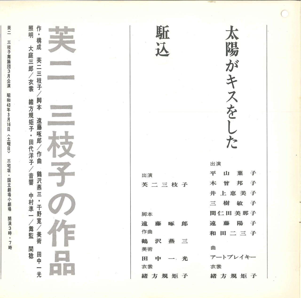 すべてのものに光を注ぎ、輝かせ、西空の雲を金色に染めて沈んでいく太陽に、若人は呼びかける。1968年初演。「芸術の先生は自然だ」と父から教わった芙二三枝子は元々「太陽」が好きだったが、人間界の煩わしさから宇宙にテーマを求めた60年代に改めて「太陽」というテーマに目覚め、66年には大作「太陽風」を発表している。また68年は“踊りはすべての人のもの”という考えを核に門下生やその教え子の子供達との合同公演「太陽の子の舞踊会」を始めた年でもある。
